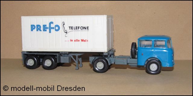 SKODA-706RTTN-Sattelzugmaschine mit LAG-Sattelauflieger und Werbecontainer "PREFO-Telefone in alle Welt" DDR-Modell (Diese Werbemodelle wurden in den 80iger Jahren vom Kombinat Spielwaren als Werbemodelle auf der Leipziger Messe an Kunden verteilt) ACHTUNG EINZELMODELL!, bitte per mail nachfragen, ob noch lieferbar! | ![]() |
